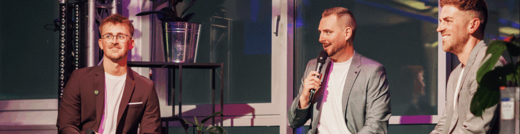 V. l. n. r.: Oliver Flug, Marketing Manager, Dominik Heinzelmann, Gründer und Geschäftsführer und Jonas Haag, Betriebsleiter (COO) der hTRIUS GmbH beim Talk-Format auf der Bühne