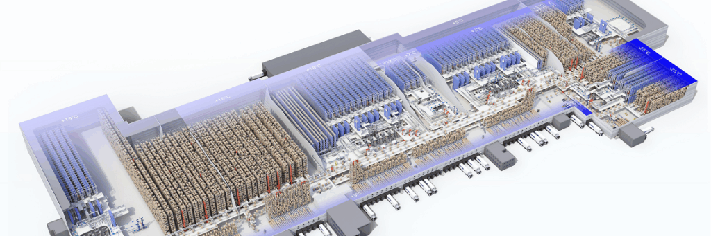 Erweitert werden hier ebenso die vorgeschalteten Paletten- und Tray-Lager (136.000 weitere Stellplätze / 27 weitere Regalbediengeräte) inkl. der Fördertechnik, Depalettierer (5 weitere) und Folien-Wickler (3 weitere).